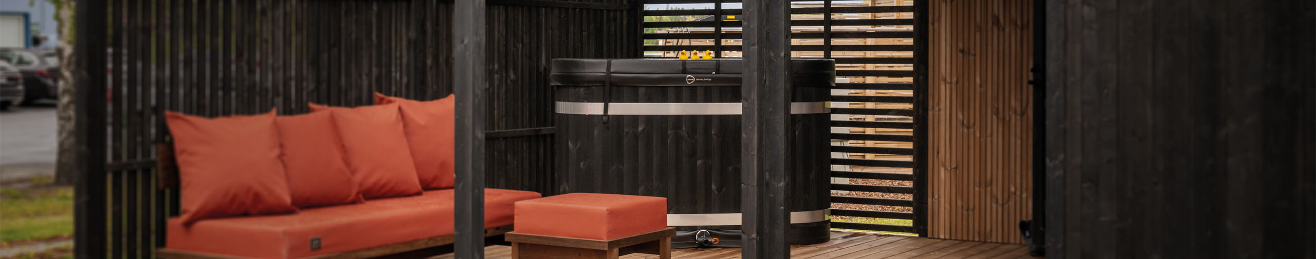 Die Außenverkleidung besteht aus schnittigen Paneelen aus wärmebehandeltem Nadelholz. Die Wärmebehandlung verbessert die Widerstandsfähigkeit des Holzes gegen Fäulnis und verringert das "Arbeiten" des Holzes, wenn es feucht ist. Das stilvolle tiefschwarze, oberflächenbehandelte Thermoholz ist langlebig und die Farbe schützt das Holz vor Schmutz und UV-Strahlung. Dieses pflegeleichte und wiederverwertbare Paneelmaterial wird auch in den Kirami FinVision® Misty-modulen verwendet. Durch die perfekt aufeinander abgestimmte Optik werden Badefass und Sauna zu einer wunderbaren Einheit. Die durchscheinende, hellgraue Innenwanne wird durch den leichten “Flöckchen-Effekt” optisch zusätzlich aufgewertet. Die helle Farbe des Innenbeckens ist ebenso zeitlos wie trendy und fügt sich wunderbar in die Umgebung ein.