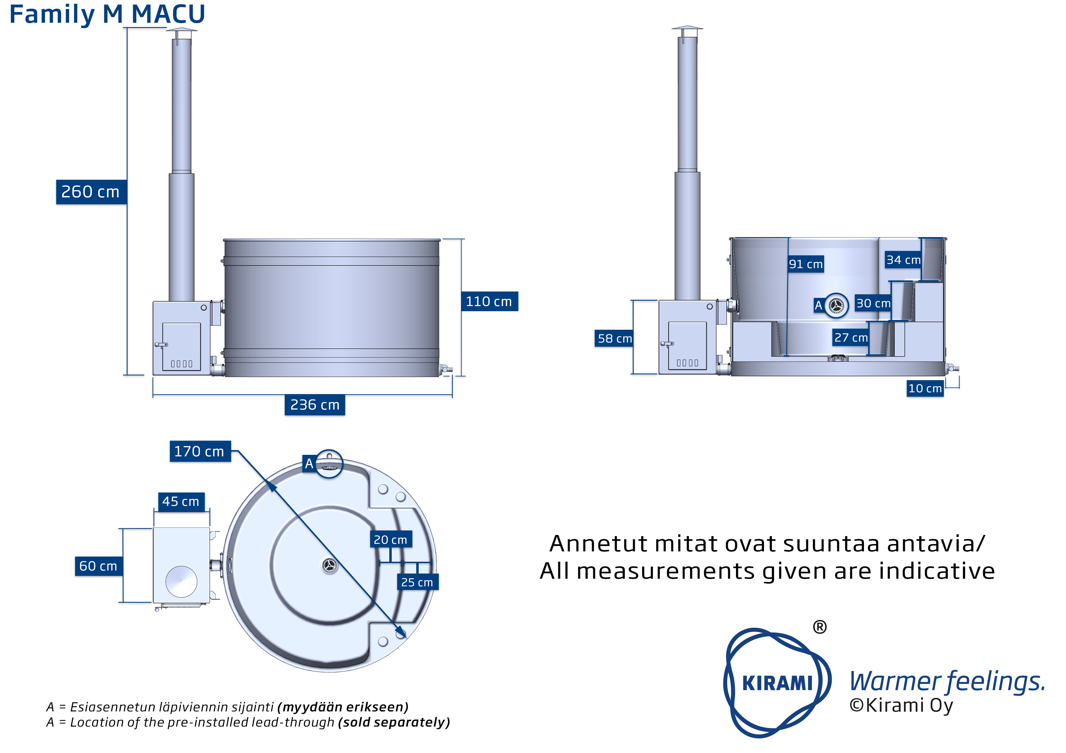 Der Durchmesser des Fasses beträgt 170 cm bei einem Fassungsvermögen von 1370 l und einem Trockengewicht von 130 kg. Das Badefass bietet Platz für 3-5 Personen. Die Bruttoleistung des MACU-Ofens liegt bei 40 kW und die dem Wasser gelieferte Leistung bei 29 kW.