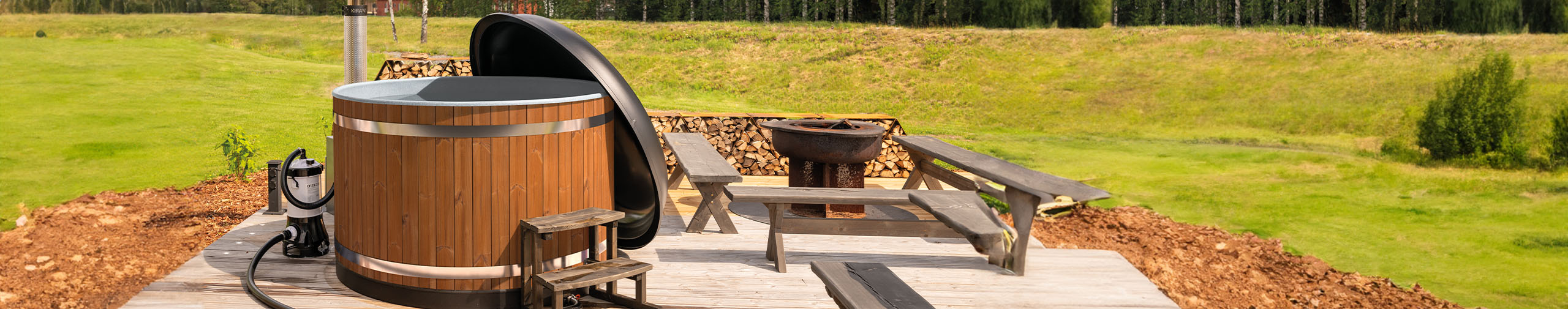 Die als Außenverkleidung dienende wärmebehandelte Kiefer ist eine einheimische Alternative zu dunklem Importholz. Thermoholz ist ein langlebiges und hochwertiges Material mit einem warmen braunen Farbton, welches seine Form beibehält. Die durchscheinende, hellgraue Innenwanne wird durch den leichten “Flöckchen-Effekt” optisch zusätzlich aufgewertet. Die helle Farbe des Innenbeckens ist ebenso zeitlos wie trendy und fügt sich wunderbar in die Umgebung ein.