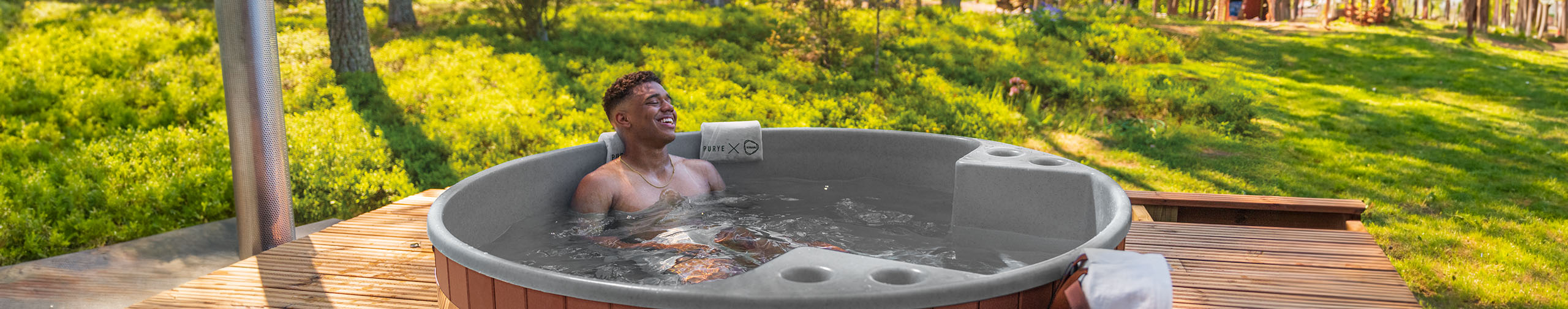 Die als Außenverkleidung dienende wärmebehandelte Kiefer ist eine einheimische Alternative zu dunklem Importholz. Thermoholz ist ein langlebiges und hochwertiges Material mit einem warmen braunen Farbton, welches seine Form beibehält. Die durchscheinende, hellgraue Innenwanne wird durch den leichten “Flöckchen-Effekt” optisch zusätzlich aufgewertet. Die helle Farbe des Innenbeckens ist ebenso zeitlos wie trendy und fügt sich wunderbar in die Umgebung ein.