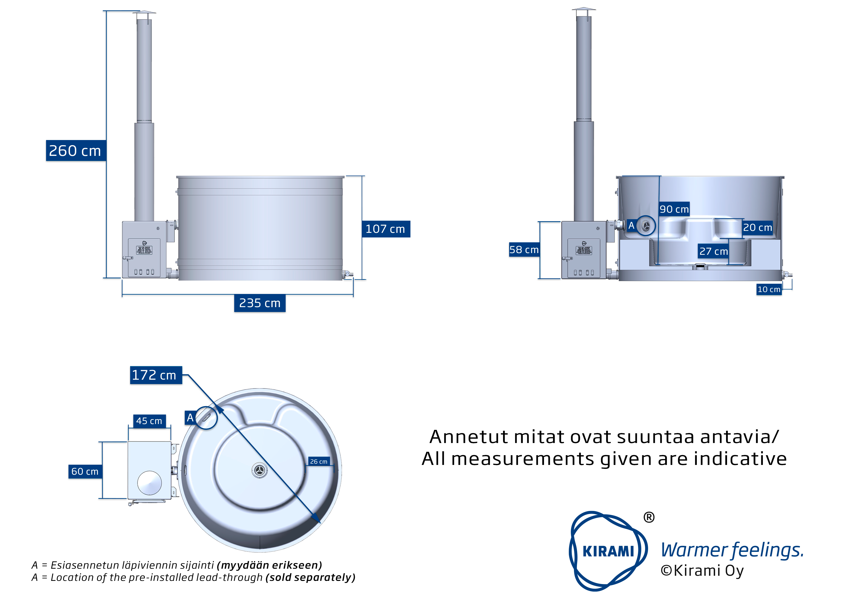 Der Durchmesser des Fasses beträgt 172 cm bei einem Fassungsvermögen von 1420 l und einem Trockengewicht von 157 kg. Das Badefass bietet Platz für 4-6 Personen. Die Bruttoleistung des CUBE-Ofens liegt bei 48 kW und die dem Wasser gelieferte Leistung bei 35 kW.