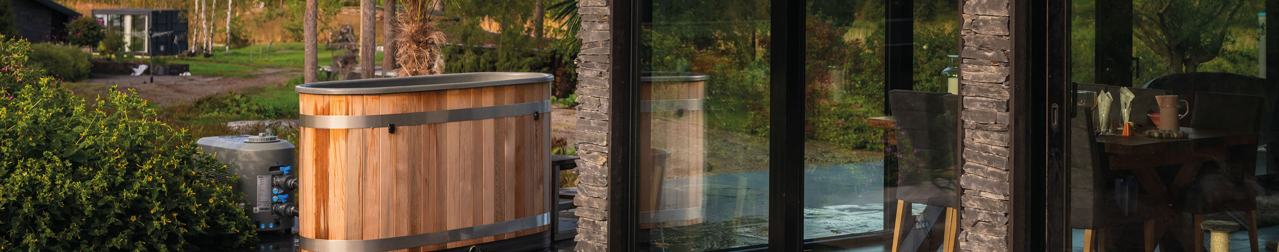 Die als Außenverkleidung dienende wärmebehandelte Kiefer ist eine einheimische Alternative zu dunklem Importholz. Thermoholz ist ein langlebiges und hochwertiges Material mit einem warmen braunen Farbton, welches seine Form beibehält. Die durchscheinende, hellgraue Innenwanne wird durch den leichten “Flöckchen-Effekt” optisch zusätzlich aufgewertet. Die helle Farbe des Innenbeckens ist ebenso zeitlos wie trendy und fügt sich wunderbar in die Umgebung ein.
