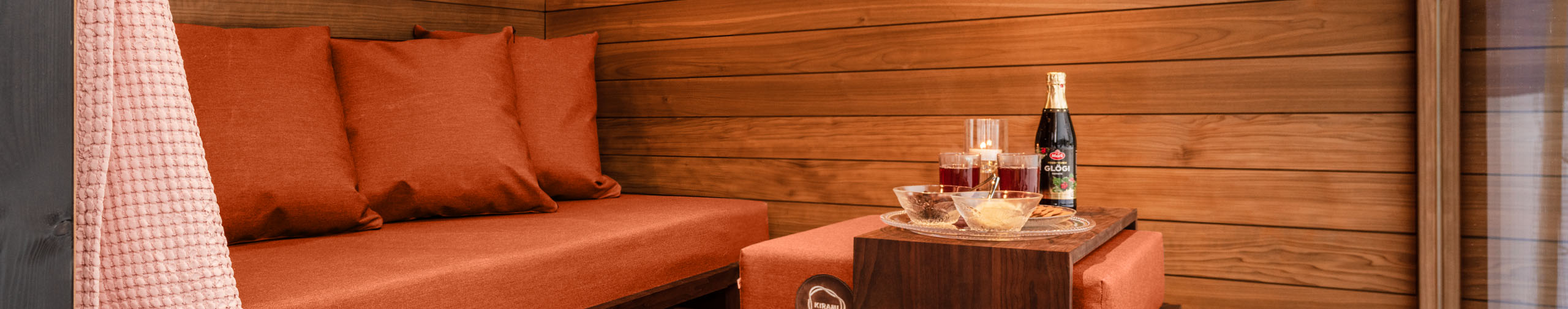 Eine rauchgraue, abschließbare Glastür mit einem schwarzen Holzrahmen schafft eine gemütliche Atmosphäre und ein Gefühl von Weite in der Lounge. Die hochwertige Thermoglastür ist solide gebaut und bleibt gut geschlossen. Die Anzahl der Türen der Lounge M hängt von der Wahl des Kunden ab und davon, ob die Lounge M neben der Sauna platziert oder als separates Modul aufgestellt wird.