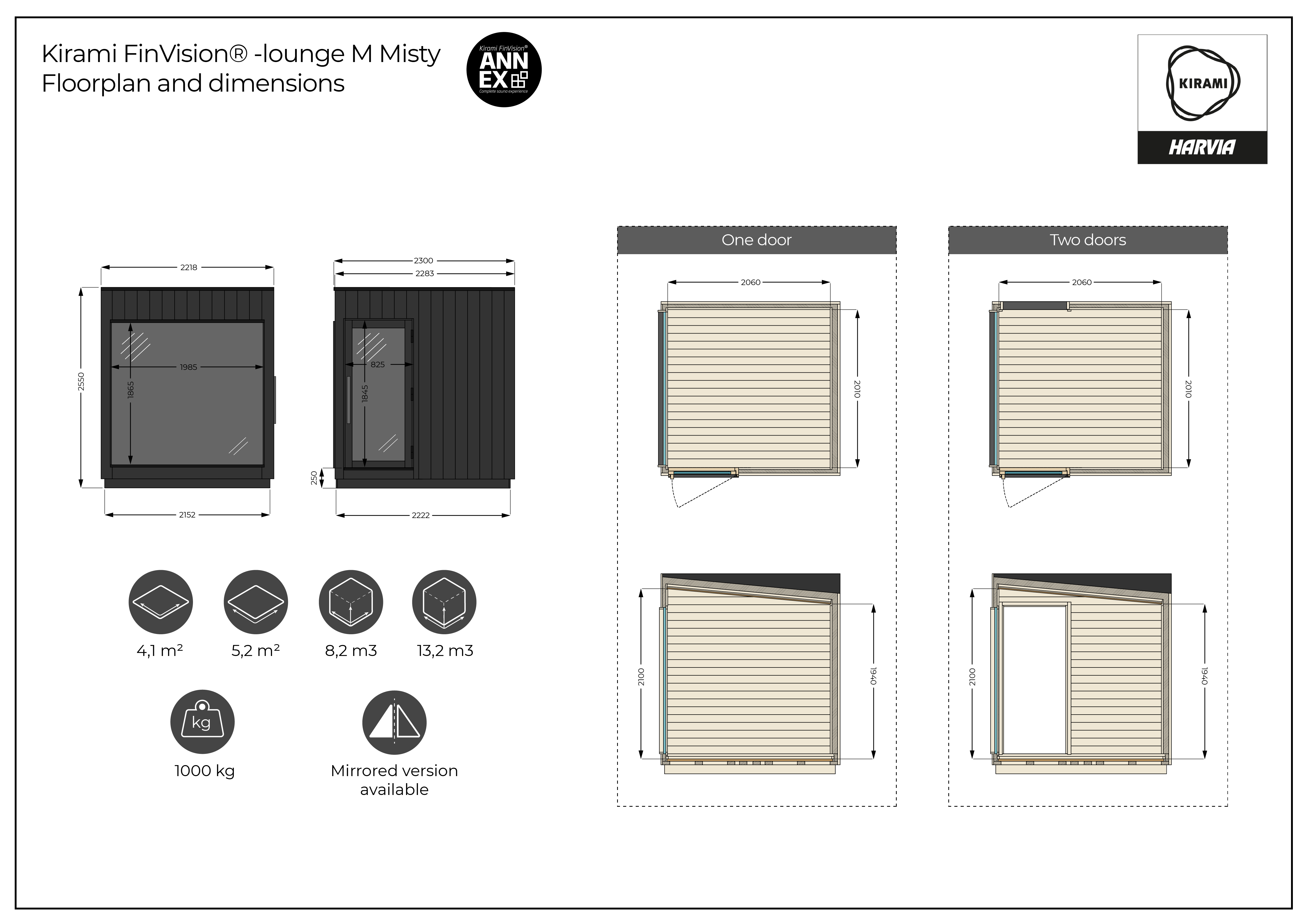 Die Kirami FinVision® -Lounge M Misty ist ein komplettes, eigenes Modul mit fertigen Wänden. Sie fügt sich nahtlos in die anderen Kirami FinVision® Misty Module ein oder kann als eigenständiges Gebäude genutzt werden. Die Lounge kann zum Beispiel als Ruhebereich oder Homeoffice genutzt werden. Die Lounge kann mit einer Kirami FinVision® -Sofagarnitur und einem -Teppich oder anderen Möbeln Ihrer Wahl eingerichtet werden.