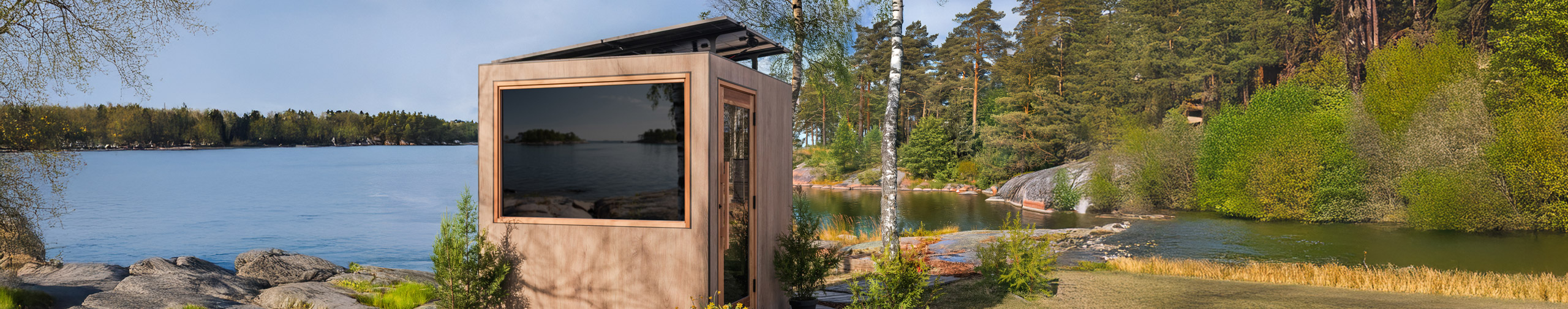 Die neu benannte Kirami FinVision® -Sauna Zero revolutioniert weiterhin die Kultur der Außensaunen mit verbesserten technischen Lösungen. Die Saunen der Produktreihe können an das Stromnetz angeschlossen werden, aber es ist auch eine Version mit Solarmodulen und einem Batteriesystem verfügbar, die eine netzunabhängige Nutzung ermöglicht.